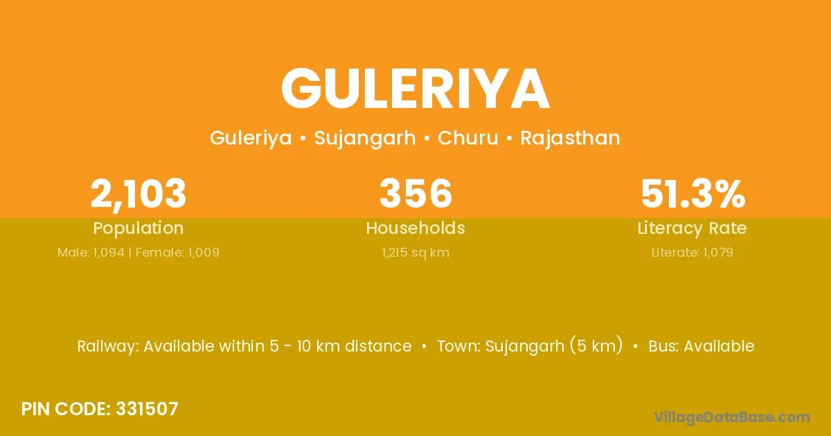Sujangarh (5 km) is the nearest town to Guleriya village for major economic activities and is located approximately 5 km away.
