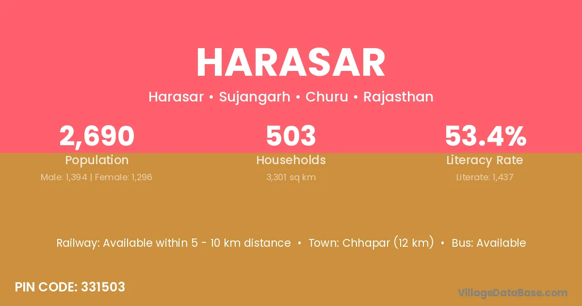 Chhapar (12 km) is the nearest town to Harasar village for major economic activities and is located approximately 12 km away.