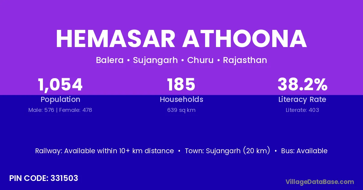 Sujangarh (20 km) is the nearest town to Hemasar Athoona village for major economic activities and is located approximately 20 km away.
