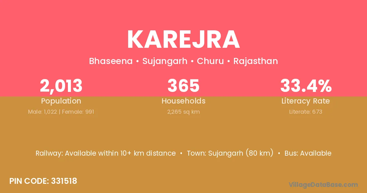 Sujangarh (80 km) is the nearest town to Karejra village for major economic activities and is located approximately 80 km away.