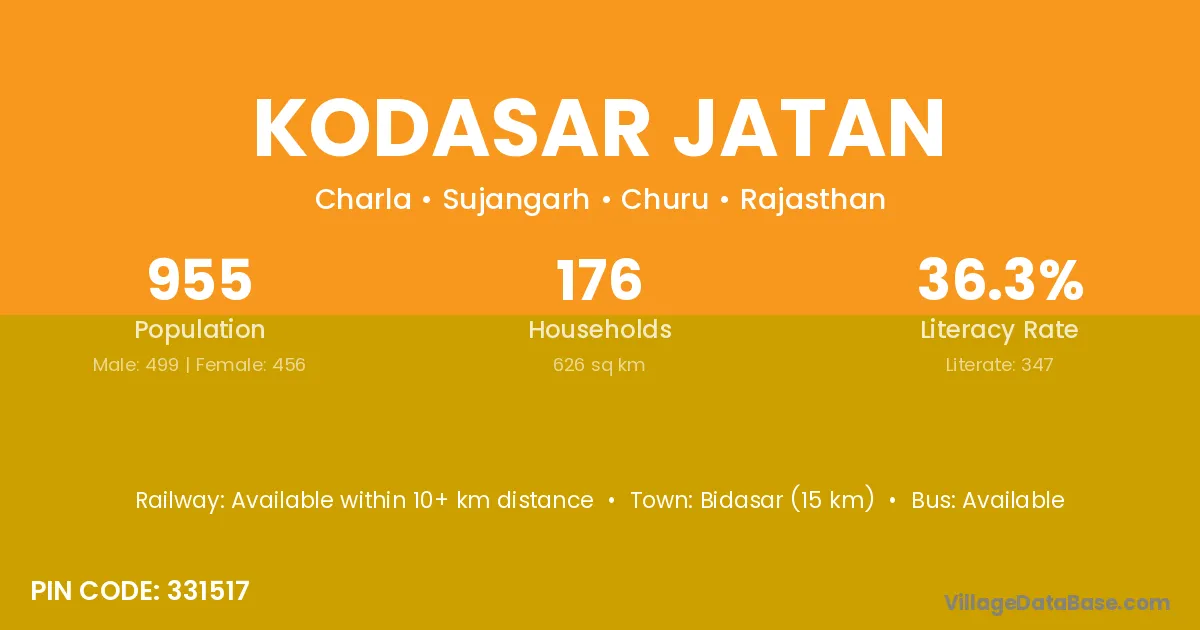 Bidasar (15 km) is the nearest town to Kodasar Jatan village for major economic activities and is located approximately 15 km away.