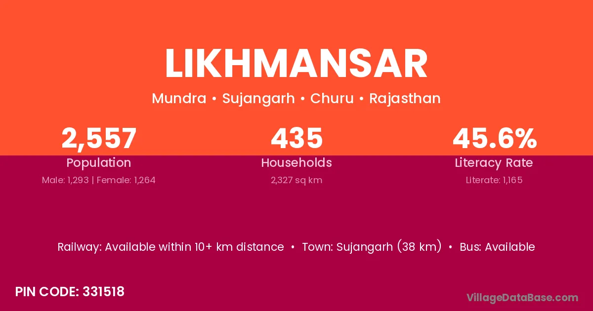 Sujangarh (38 km) is the nearest town to Likhmansar village for major economic activities and is located approximately 38 km away.