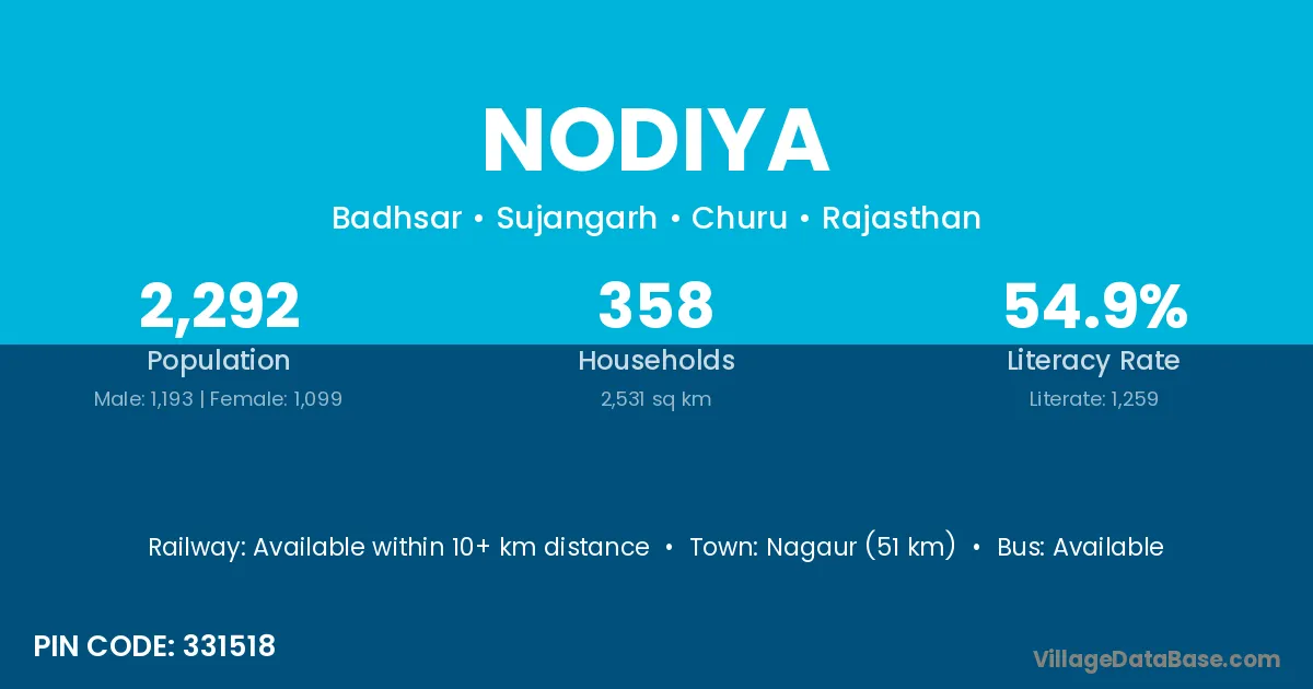 Nagaur (51 km) is the nearest town to Nodiya village for major economic activities and is located approximately 51 km away.