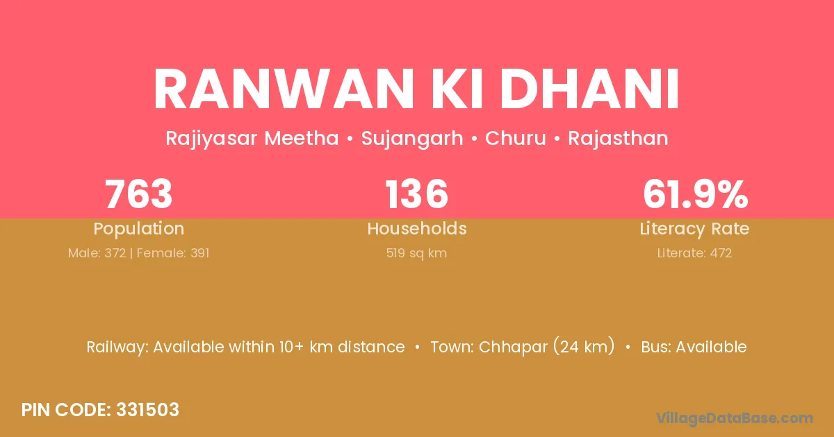 Ranwan Ki Dhani village has a total population of 763 people, of which 372 are males and 391 are females.