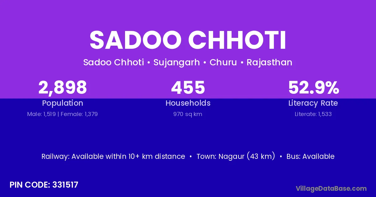 Nagaur (43 km) is the nearest town to Sadoo Chhoti village for major economic activities and is located approximately 43 km away.
