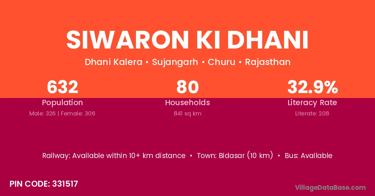Siwaron Ki Dhani village has a total population of 632 people, of which 326 are males and 306 are females.