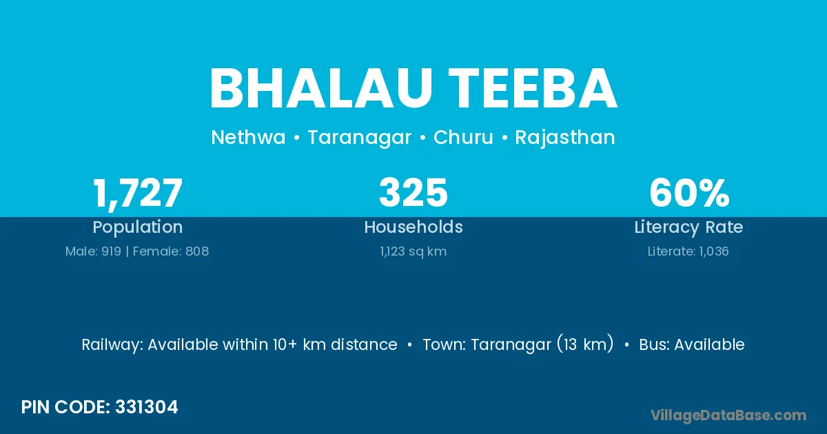 Taranagar (13 km) is the nearest town to Bhalau Teeba village for major economic activities and is located approximately 13 km away.