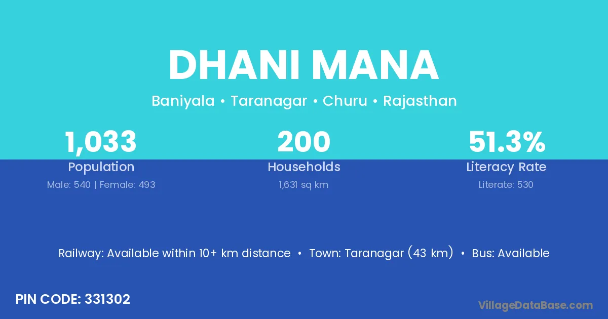 Taranagar (43 km) is the nearest town to Dhani Mana village for major economic activities and is located approximately 43 km away.