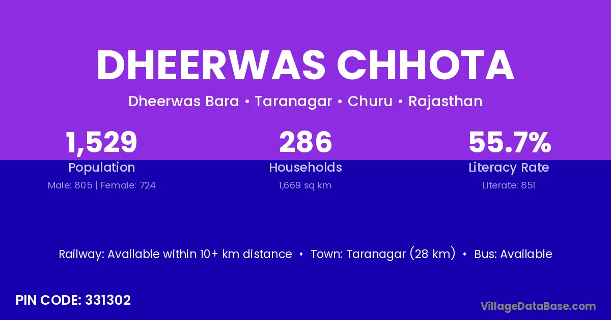 Taranagar (28 km) is the nearest town to Dheerwas Chhota village for major economic activities and is located approximately 28 km away.