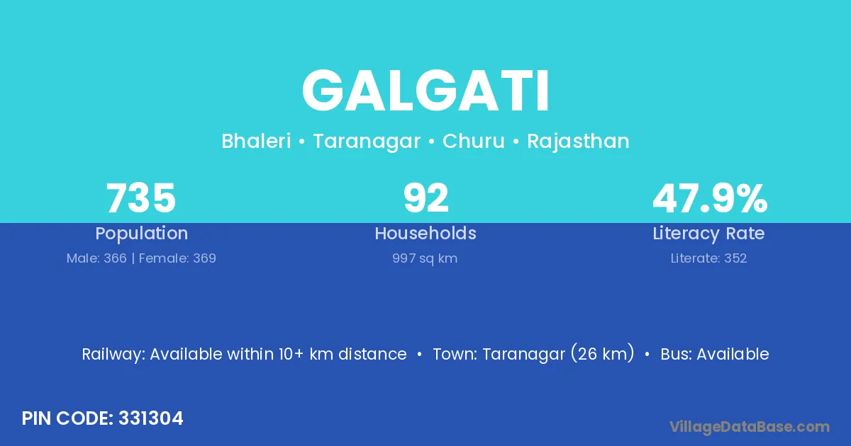 Galgati village has a total population of 735 people, of which 366 are males and 369 are females.