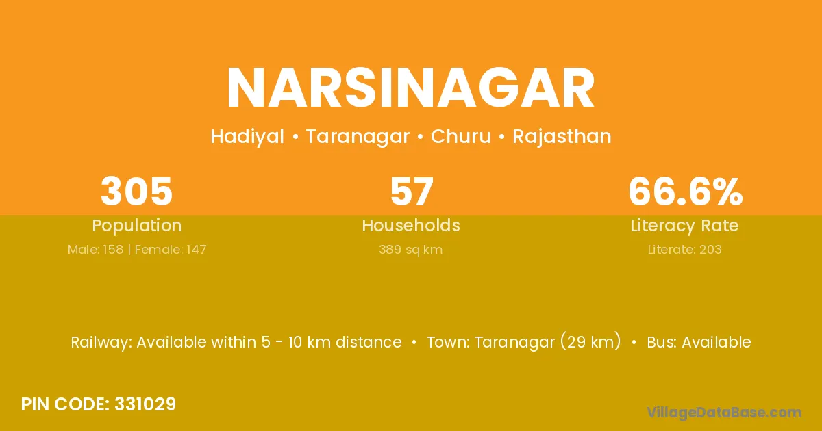 Taranagar (29 km) is the nearest town to Narsinagar village for major economic activities and is located approximately 29 km away.