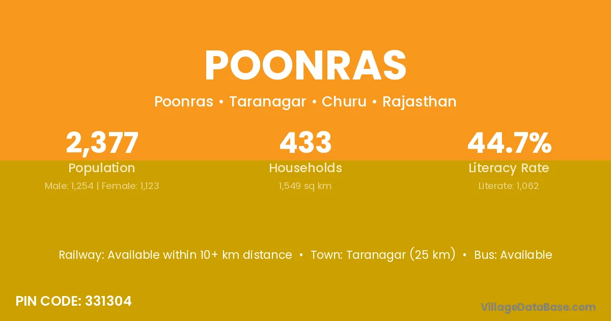 Taranagar (25 km) is the nearest town to Poonras village for major economic activities and is located approximately 25 km away.