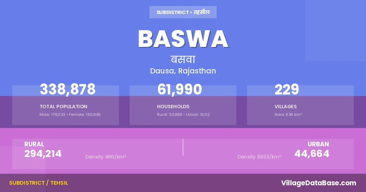 According to the 2011 census The total area of Baswa Tehsil is 636 km², with a population of 338878 people. The population density is 533 inhabitants per square kilometre, and there are approximately 61990 houses in the sub district.