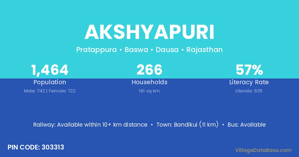 Bandikui (11 km) is the nearest town to Akshyapuri village for major economic activities and is located approximately 11 km away.