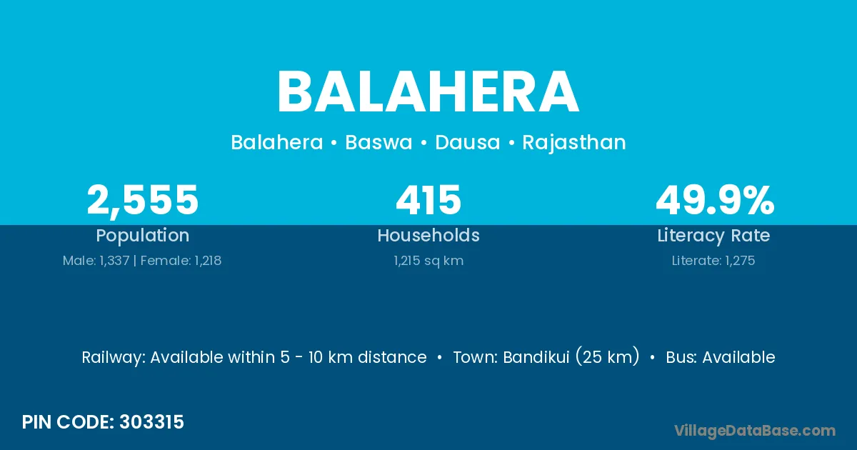 Bandikui (25 km) is the nearest town to Balahera village for major economic activities and is located approximately 25 km away.