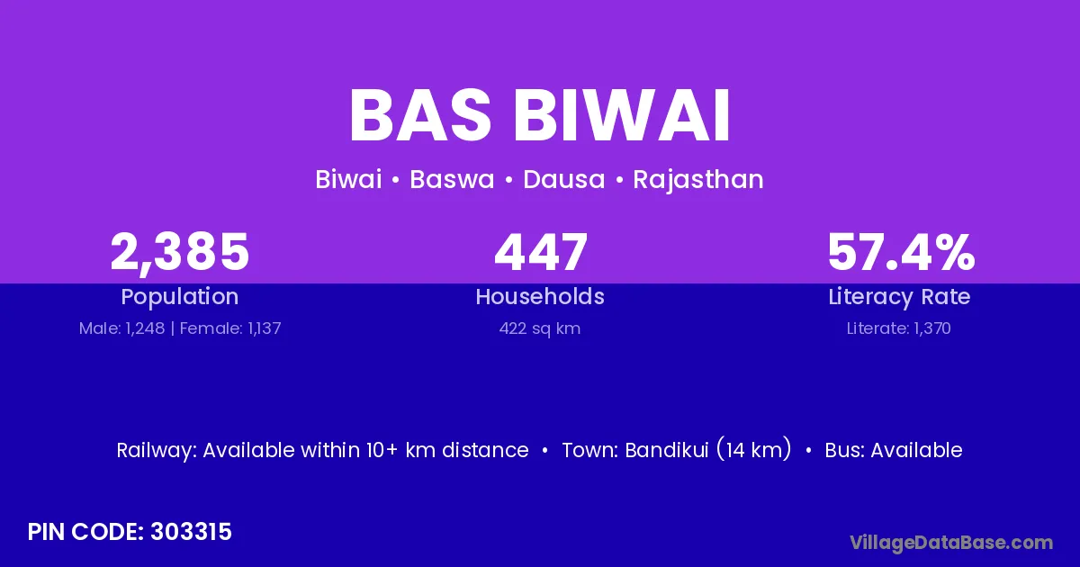 Bandikui (14 km) is the nearest town to Bas Biwai village for major economic activities and is located approximately 14 km away.