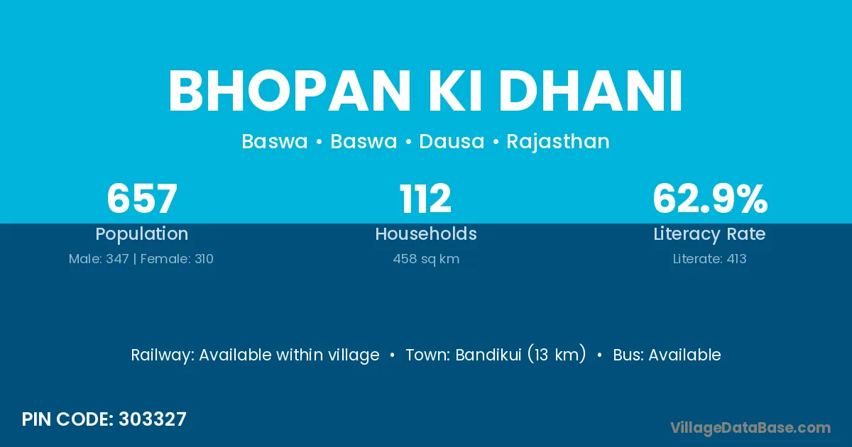 Bhopan Ki Dhani village has a total population of 657 people, of which 347 are males and 310 are females.