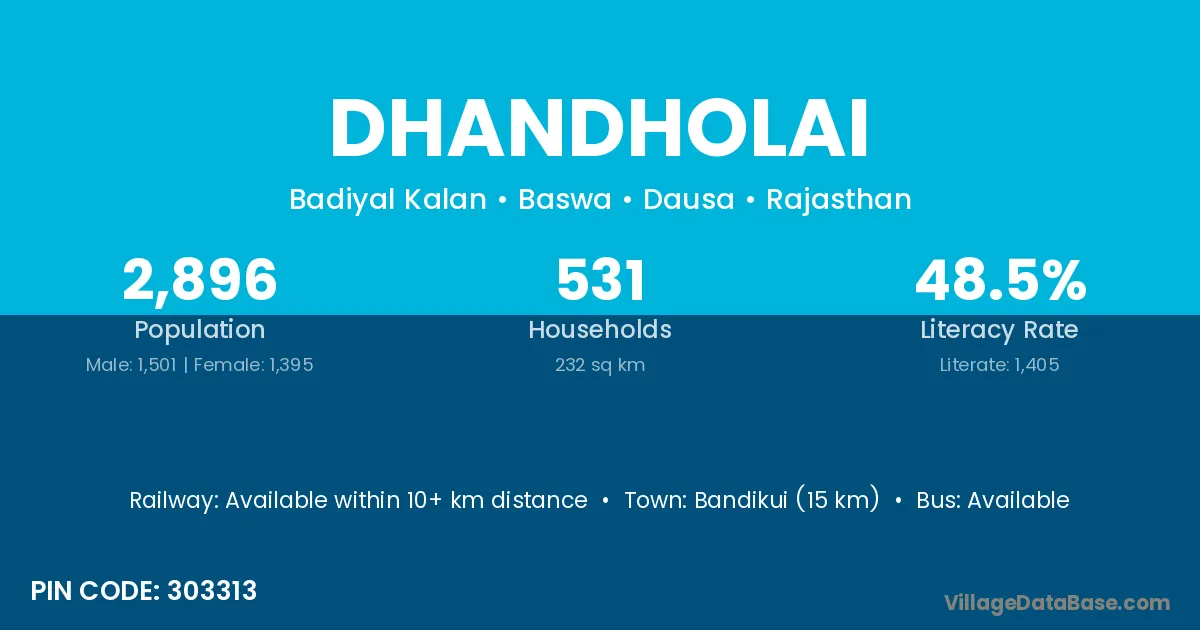 Bandikui (15 km) is the nearest town to Dhandholai village for major economic activities and is located approximately 15 km away.
