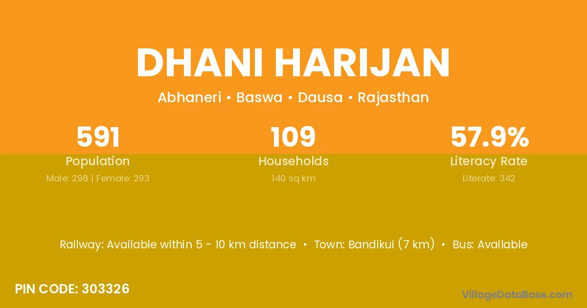 Dhani Harijan village has a total population of 591 people, of which 298 are males and 293 are females.