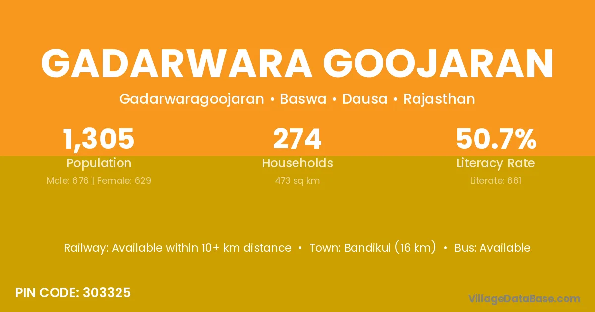 Bandikui (16 km) is the nearest town to Gadarwara Goojaran village for major economic activities and is located approximately 16 km away.