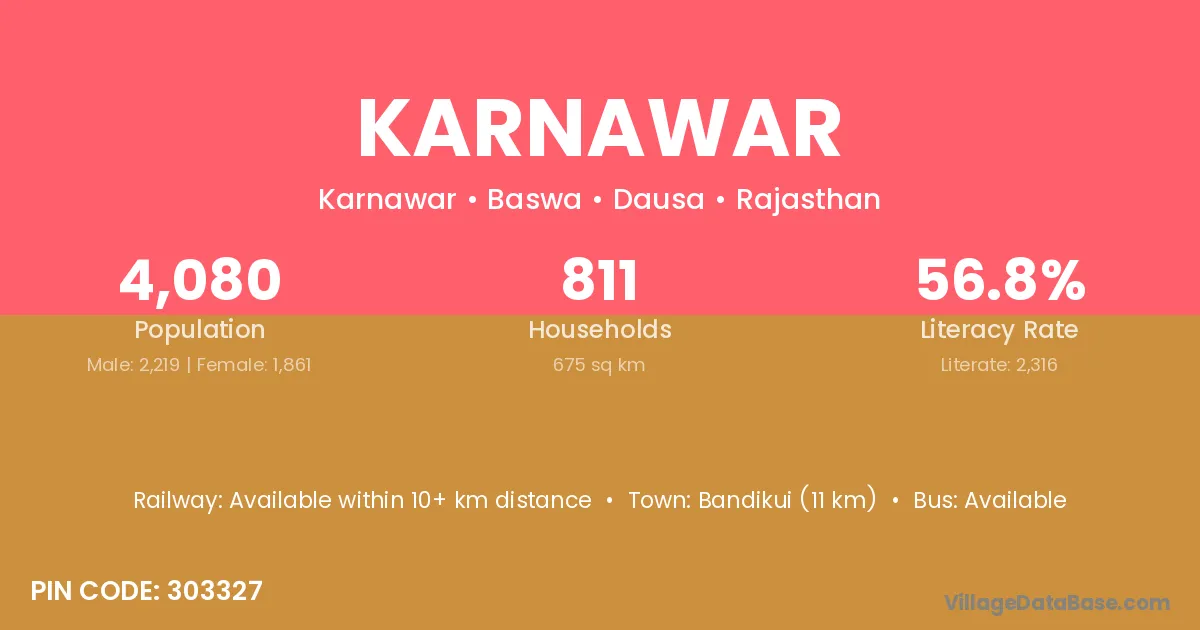 Bandikui (11 km) is the nearest town to Karnawar village for major economic activities and is located approximately 11 km away.