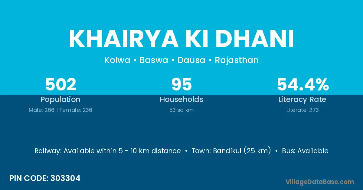 Bandikui (25 km) is the nearest town to Khairya Ki Dhani village for major economic activities and is located approximately 25 km away.