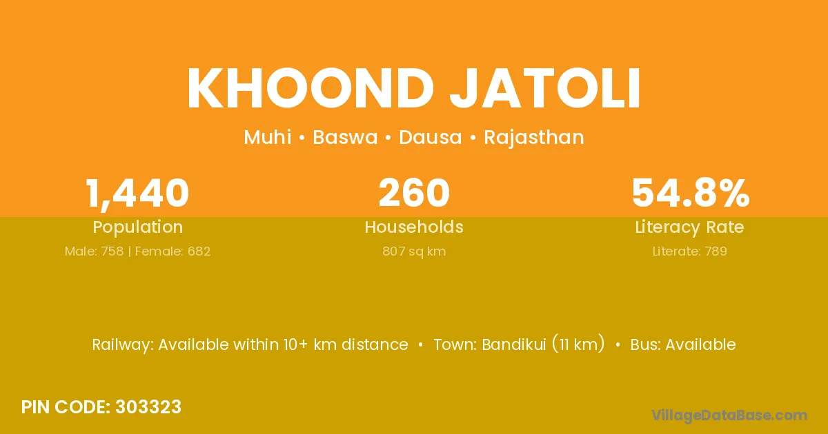 Bandikui (11 km) is the nearest town to Khoond Jatoli village for major economic activities and is located approximately 11 km away.