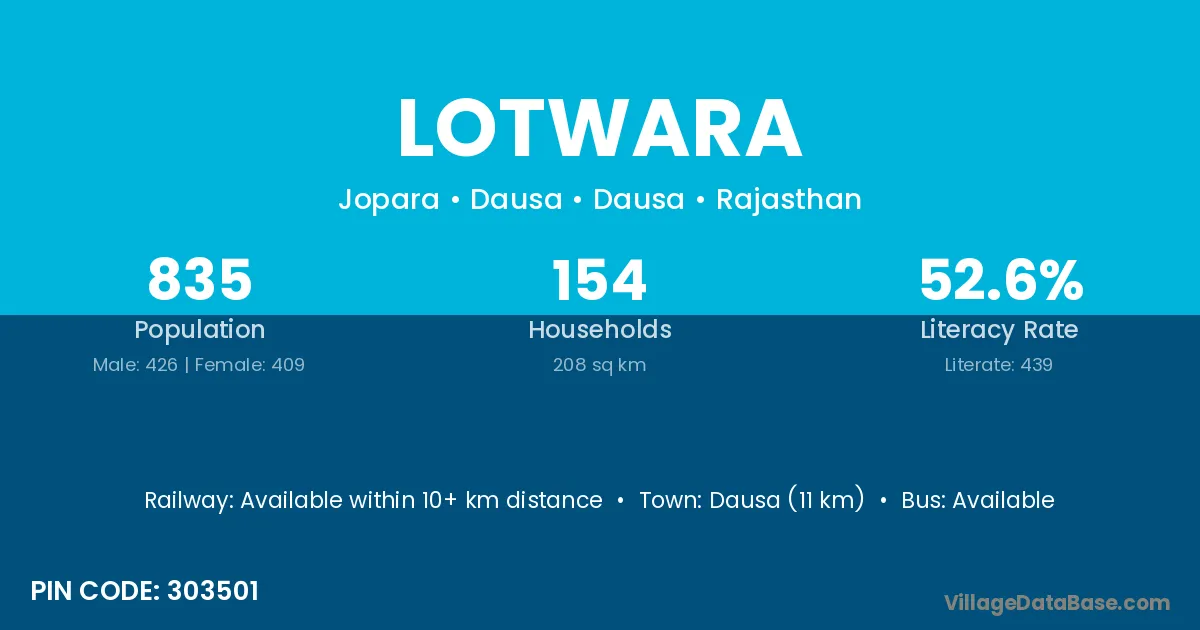 Bandikui (20 km) is the nearest town to Lotwara village for major economic activities and is located approximately 20 km away.