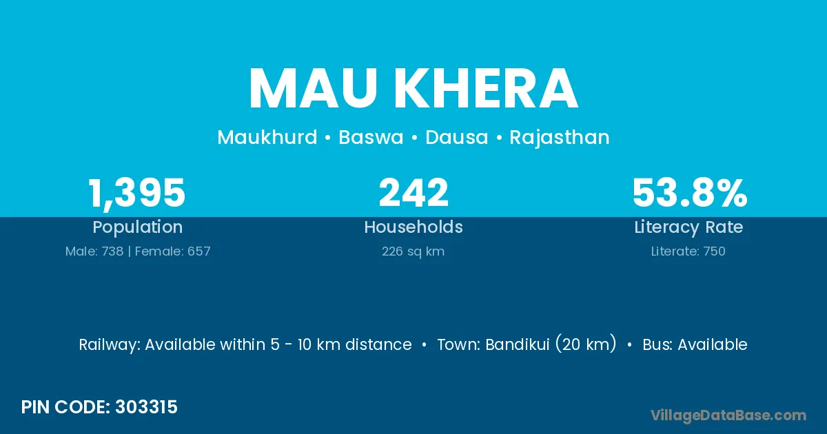 Bandikui (20 km) is the nearest town to Mau Khera village for major economic activities and is located approximately 20 km away.