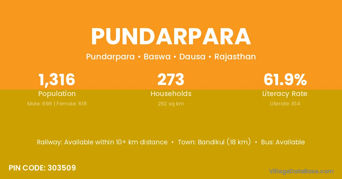 Bandikui (18 km) is the nearest town to Pundarpara village for major economic activities and is located approximately 18 km away.