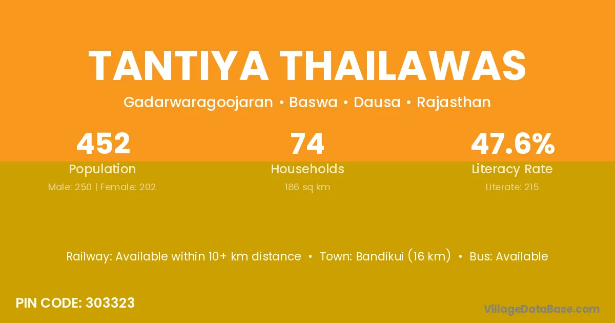 Bandikui (16 km) is the nearest town to Tantiya Thailawas village for major economic activities and is located approximately 16 km away.