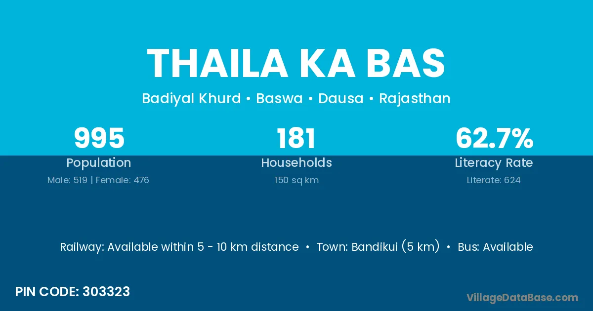 Bandikui (5 km) is the nearest town to Thaila Ka Bas village for major economic activities and is located approximately 5 km away.