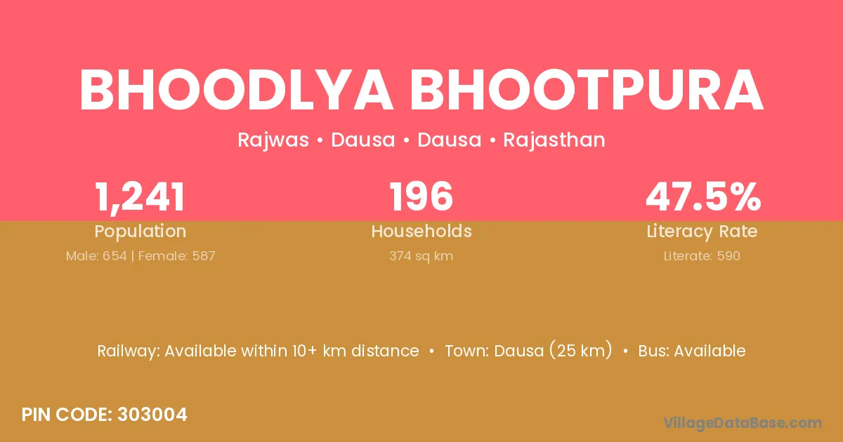 Dausa (25 km) is the nearest town to Bhoodlya Bhootpura village for major economic activities and is located approximately 25 km away.