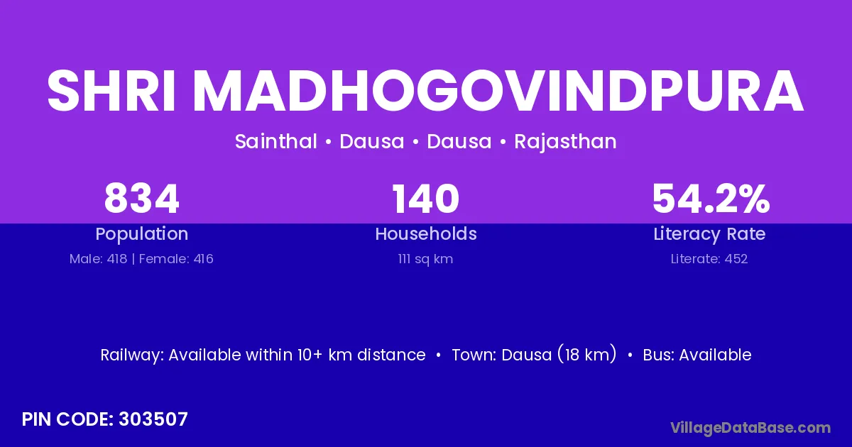 Dausa (18 km) is the nearest town to Shri Madhogovindpura village for major economic activities and is located approximately 18 km away.