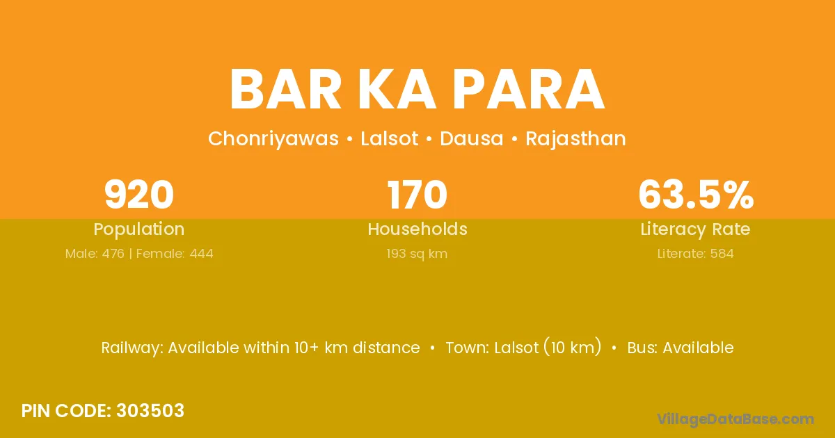Lalsot (10 km) is the nearest town to Bar Ka Para village for major economic activities and is located approximately 10 km away.