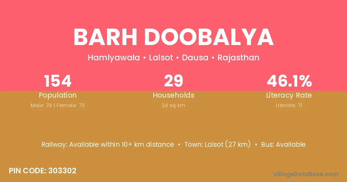 Lalsot (27 km) is the nearest town to Barh Doobalya village for major economic activities and is located approximately 27 km away.