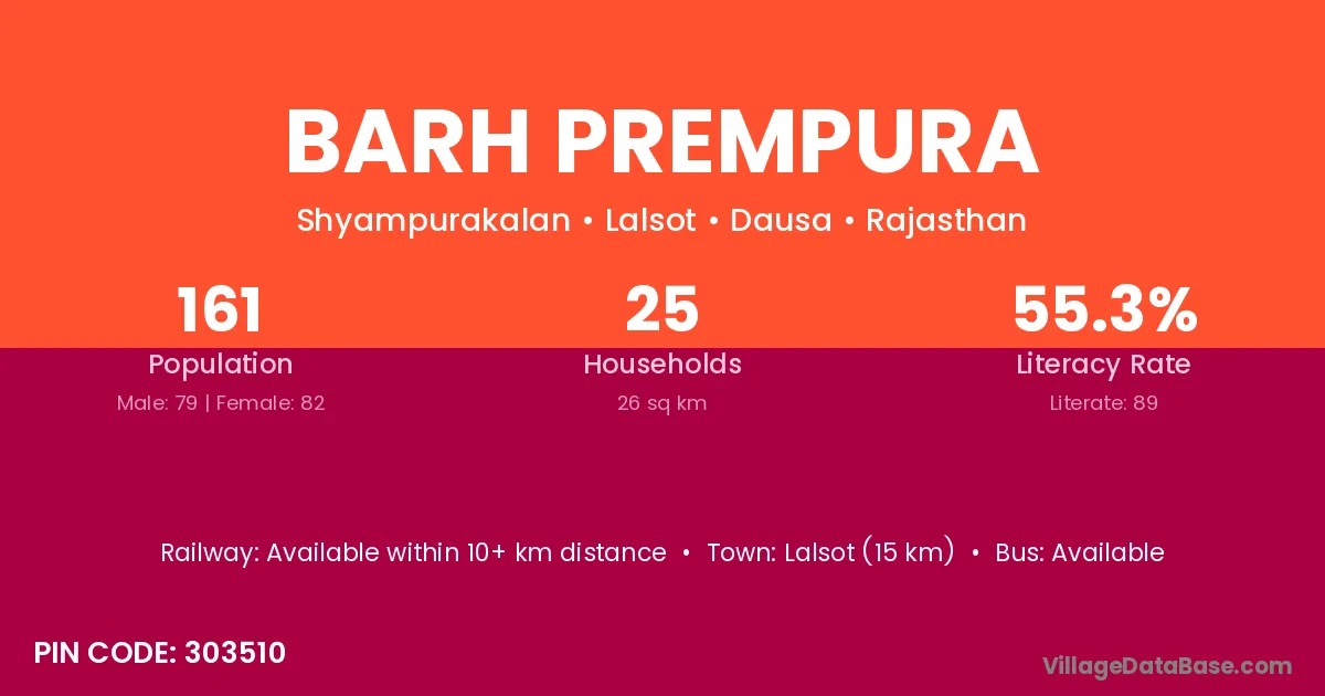Lalsot (15 km) is the nearest town to Barh Prempura village for major economic activities and is located approximately 15 km away.