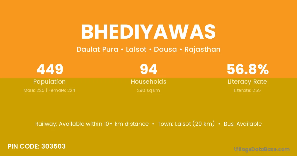 Bhediyawas village has a total population of 449 people, of which 225 are males and 224 are females.