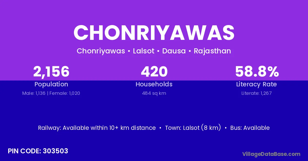 Lalsot (8 km) is the nearest town to Chonriyawas village for major economic activities and is located approximately 8 km away.