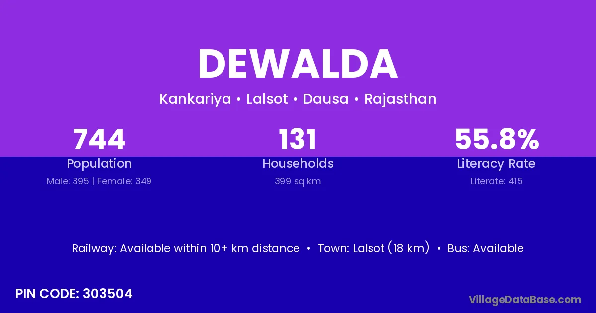 Lalsot (18 km) is the nearest town to Dewalda village for major economic activities and is located approximately 18 km away.