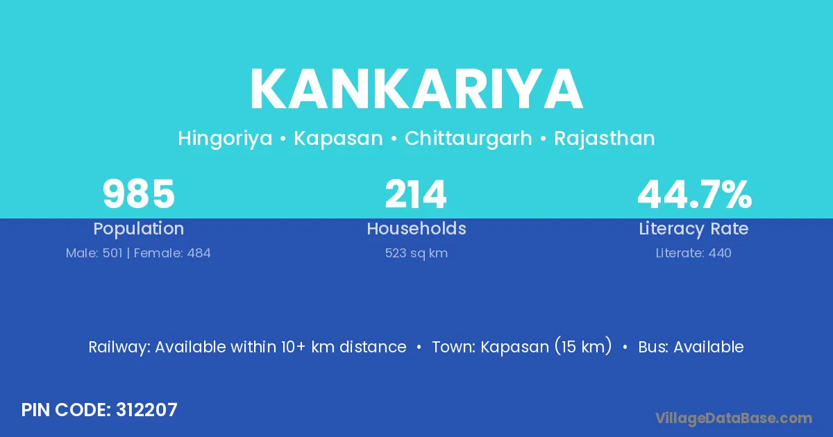 Lalsot (15 km) is the nearest town to Kankariya village for major economic activities and is located approximately 15 km away.