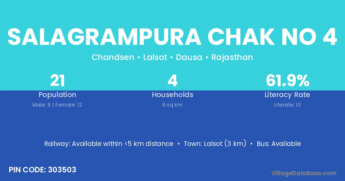 Salagrampura Chak No 4 village has a total population of 21 people, of which 9 are males and 12 are females.