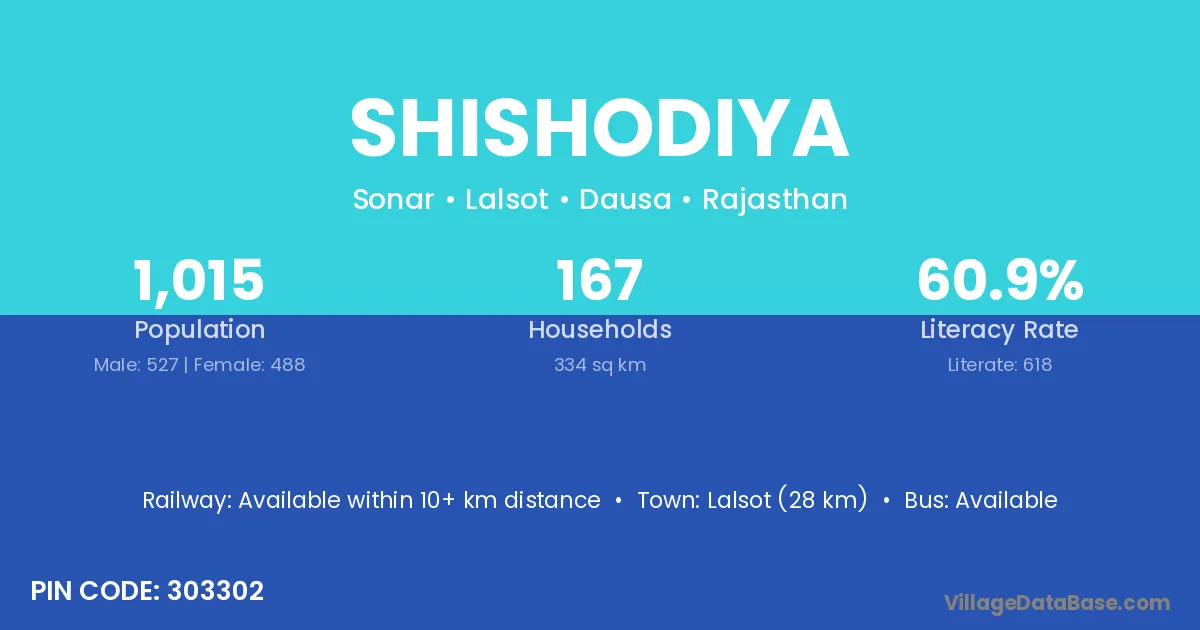 Lalsot (28 km) is the nearest town to Shishodiya village for major economic activities and is located approximately 28 km away.