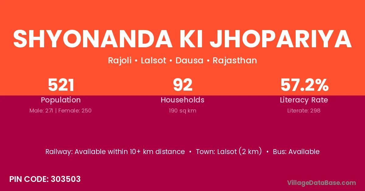 Lalsot (2 km) is the nearest town to Shyonanda Ki Jhopariya village for major economic activities and is located approximately 2 km away.