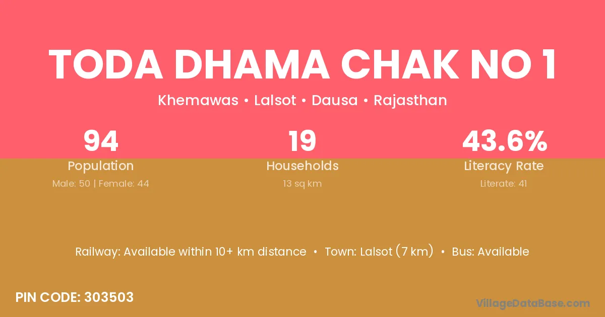 Toda Dhama Chak No 1 village has a total population of 94 people, of which 50 are males and 44 are females.