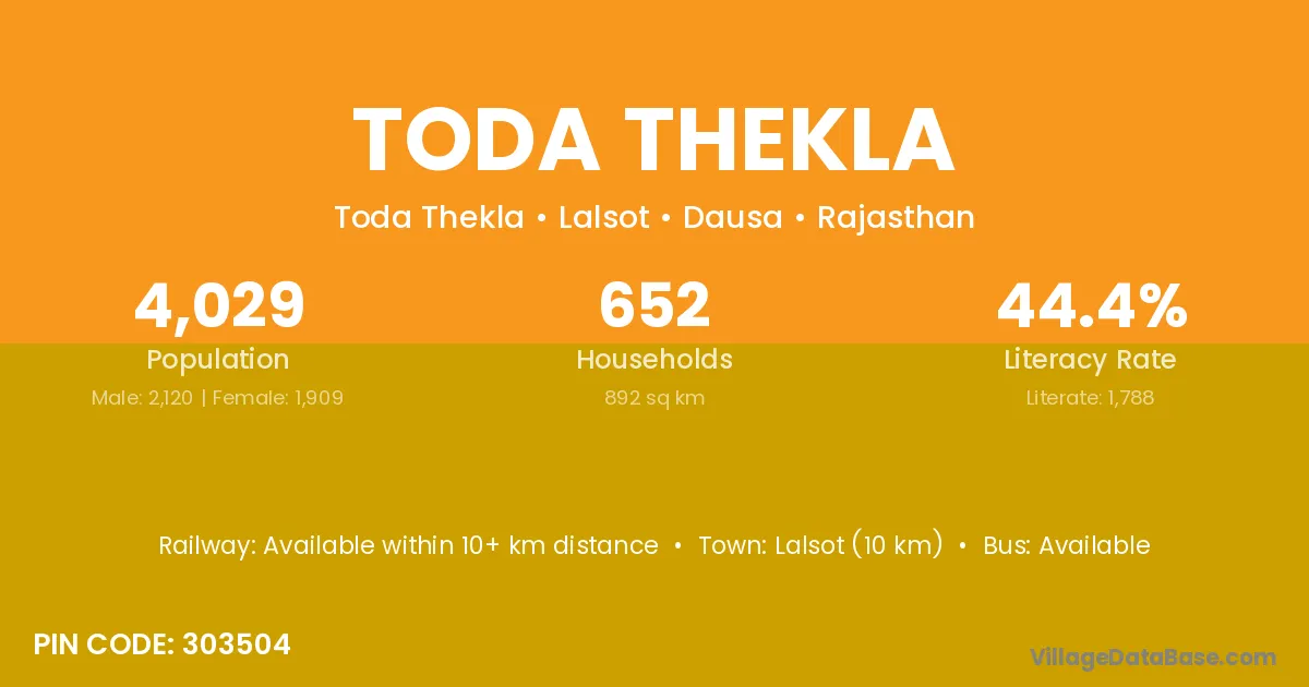 Lalsot (10 km) is the nearest town to Toda Thekla village for major economic activities and is located approximately 10 km away.