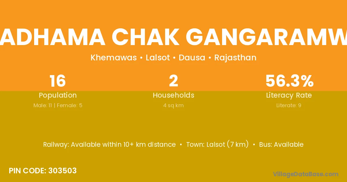 Todadhama Chak Gangaramwala village has a total population of 16 people, of which 11 are males and 5 are females.