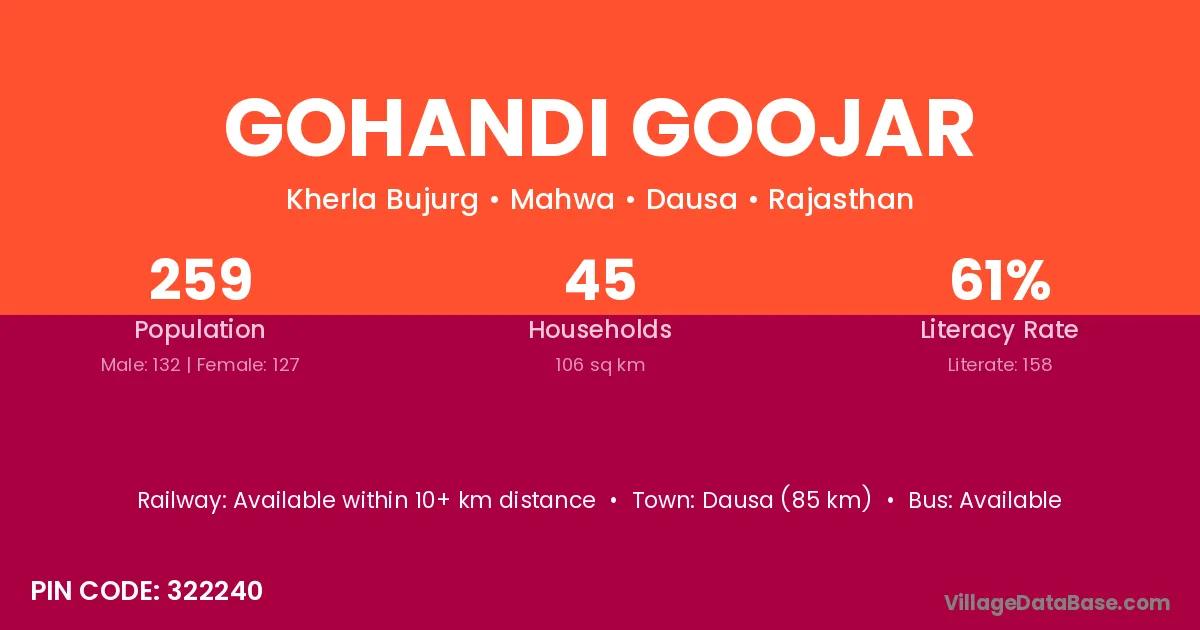Gohandi Goojar village has a total population of 259 people, of which 132 are males and 127 are females.