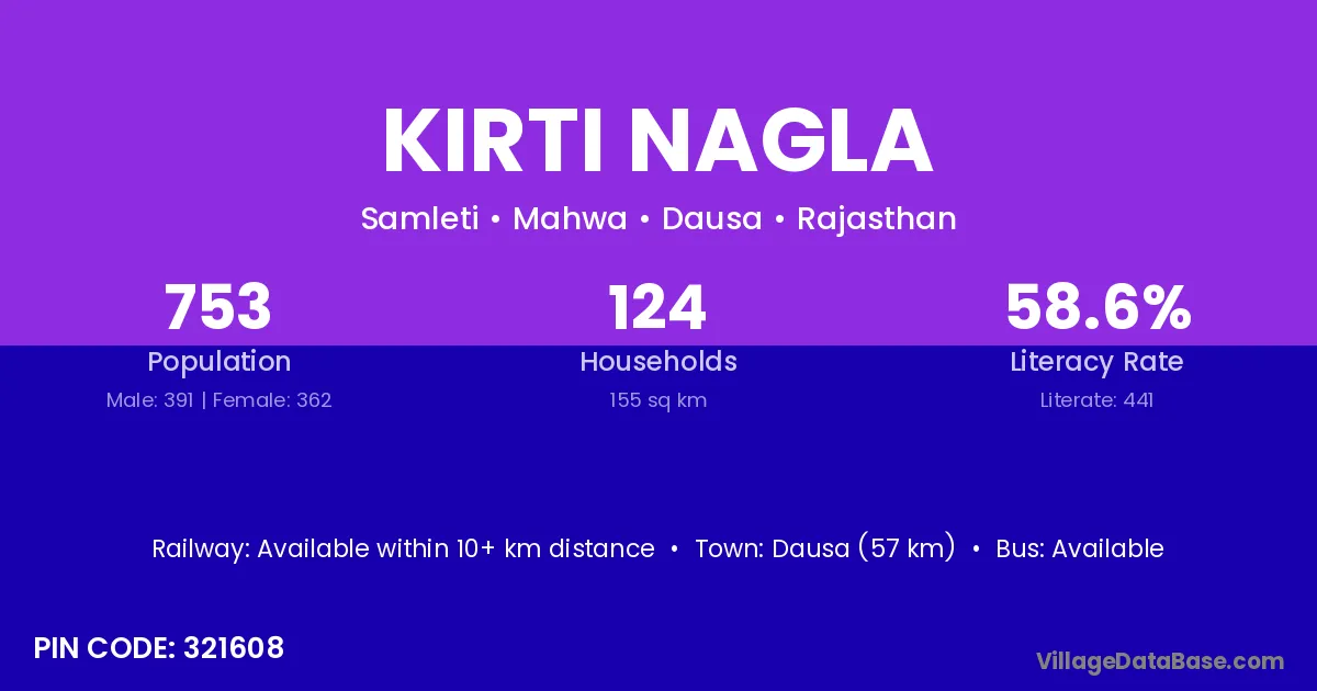 Dausa (57 km) is the nearest town to Kirti Nagla village for major economic activities and is located approximately 57 km away.