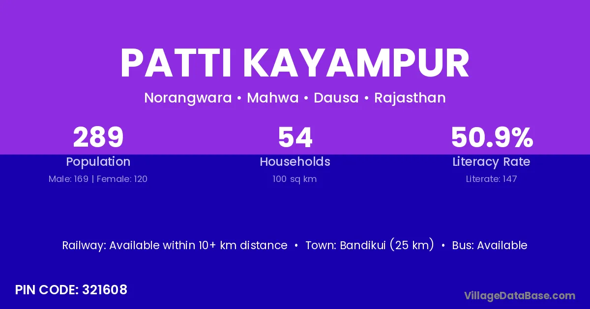 Bandikui (25 km) is the nearest town to Patti Kayampur village for major economic activities and is located approximately 25 km away.